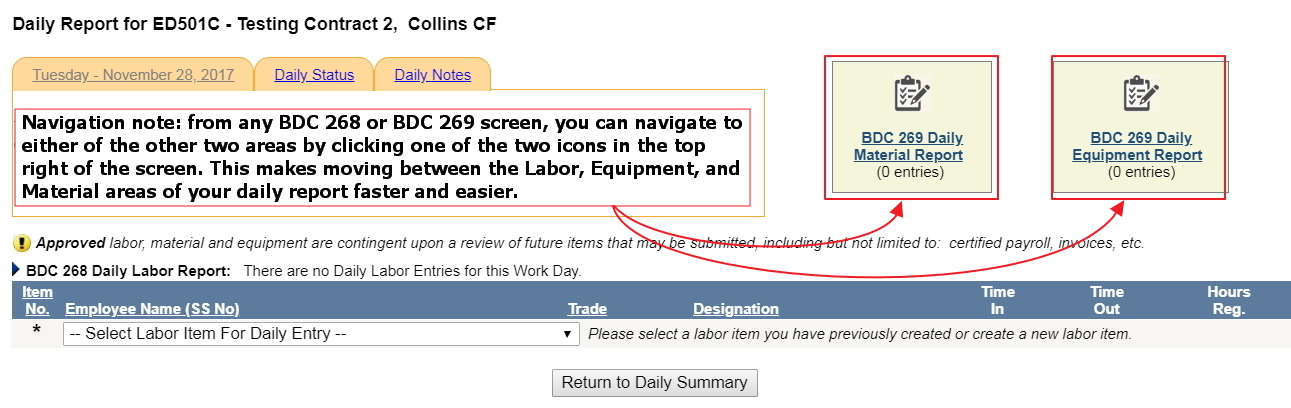 Navigation note: from any BDC 268 or BDC 269 screen, you can navigate to either of the other two areas by clicking one of the two icons in the top right of the screen. This makes moving between the Labor, Equipment, and Material areas of your daily report faster and easier.
