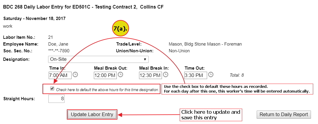 Here is a completed Daily Labor Entry. Note that the check box to default these hours for this designation has been selected. This is a convenience for you, as it allows you to automatically repeat this worker's time entries on future days for this designation. The default can be removed later by using the same checkbox, and time entry fields can be manually adjusted even when the default checkbox is selected.