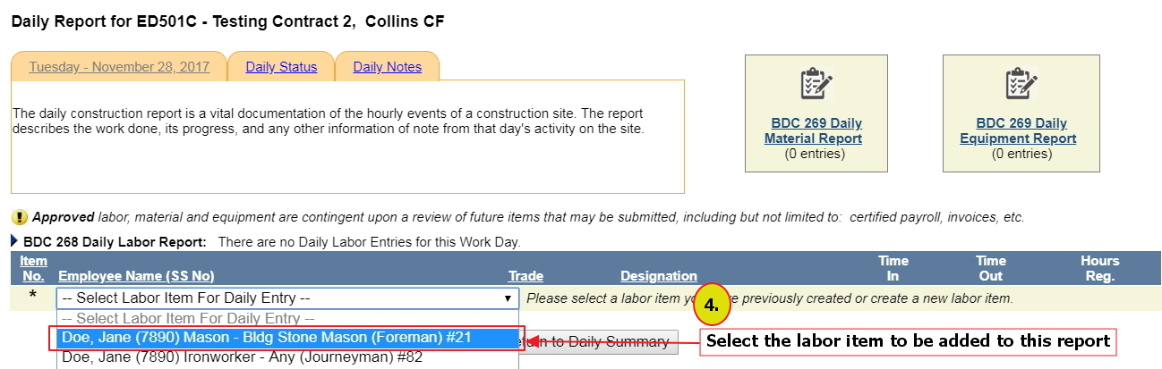 In the BDC 268 screen, select an employee from the drop-down list or select Create Additional Labor Item to create a new item (see Create a Labor Item). Here, we are selecting an existing labor item: Jane Doe, Mason…